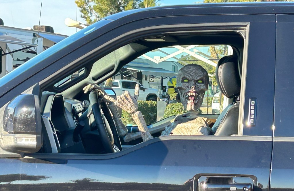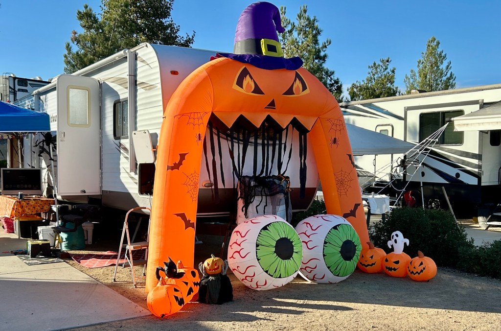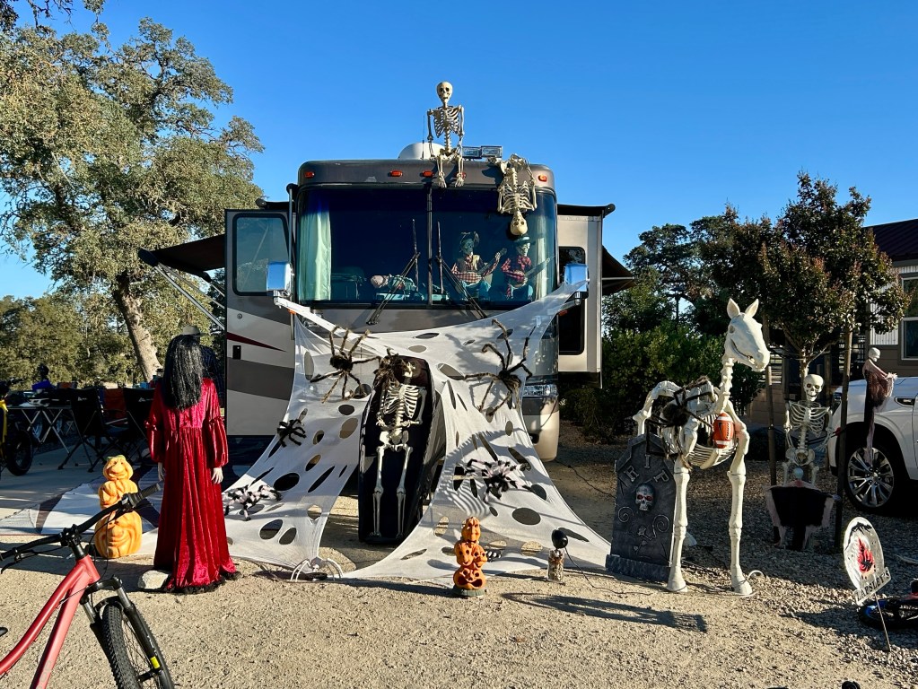 When we pulled into our campsite for the next three days - Sun Resorts Paso Robles - there was a very long line to check-in. DT stayed in the RV and I walked up to the office to check-in. Every person in the office was in (Halloween) costume. We learned it was “Halloween Weekend” at this resort and soon saw so many families and so many kids and so many dogs and so many golf carts decorated for Halloween. Apparently Halloween weekend is a big thing at this RV resort, (where you can also rent golf carts - and there is no golf course here). I don’t think we will be getting any early nights, but kids will be having fun, so the Bubbe in me will be chill with the thrills. Dave went out on a walk after we set up camp and snapped photos of decorated campsites.