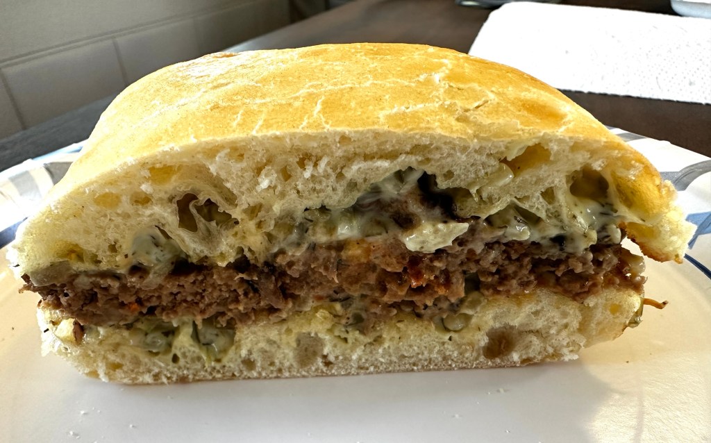 Our lunch stop was near Gilroy where we pulled into a vast empty random parking lot for lunch. I grilled a panini sandwich roll in a skillet and smothered both sides with Molly Yeh’s Dill Mayo while slices of the leftover Mustard’s Grill meatloaf heated in the same skillet.