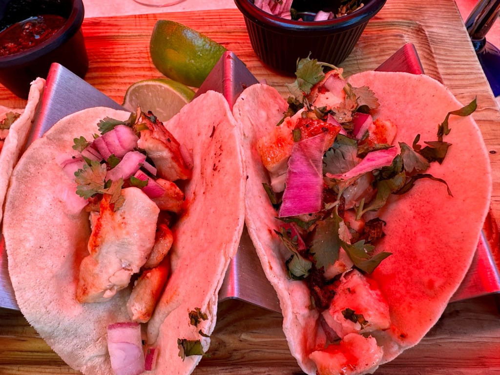 We sat under a red umbrella, so had a ruby-tinged meal!