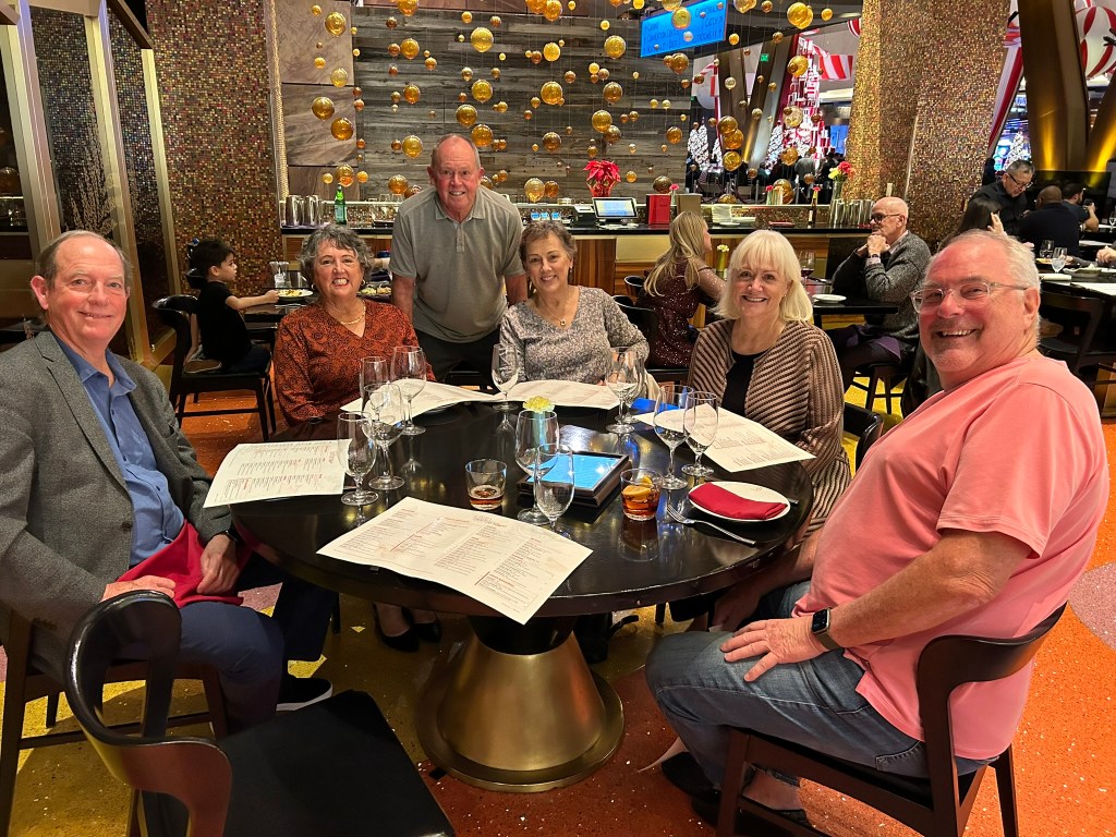 As I previously reported, our friends arrived Tuesday evening and we all dined at Javier's Cantina. (I learned through Lisa this is now a six-store chain.) Wednesday we retraced our steps as everyone (else) wanted to see the Bellagio holiday display. So many steps on my pedometer! Wednesday night Mary hosted us to Steve's birthday dinner at Julian Serrano Tapas Bar at the Aria Hotel (which I heard as a topless bar and thought it quite odd Steve would choose to have dinner at a topless bar... let alone choose to drag us with him). Note to self: get hearing checked. Before heading to the 5:15p football game on Thursday, we all dined at Din Tai Fung, the famed Taiwanese soup dumpling restaurant taking over the world. At one point or another in our lives, we had all lived on Taiwan, so had a little trip down memory lane before heading over to the game... and OMG - are their pretty dumplings are divine.