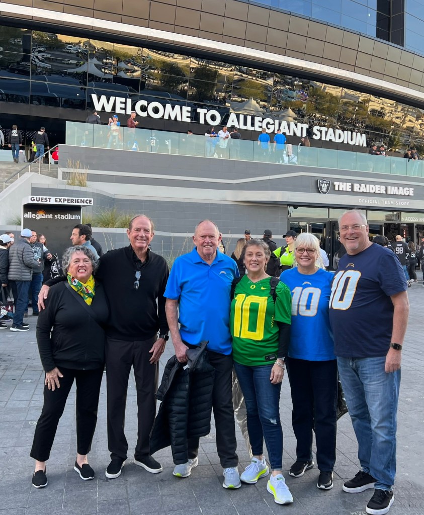 In our green & yellow, Mary and I had so many GO DUCKS shout-outs from strangers at the game. So much fun. I guess they all knew why we were there. And we did see Justin Herbert. He was in shorts and a fleece hoodie on the sidelines during the entire game. After receiving surgery on his right (throwing hand) index finger Monday, his right arm was in a sling and his empty sleeve was hanging to his side.