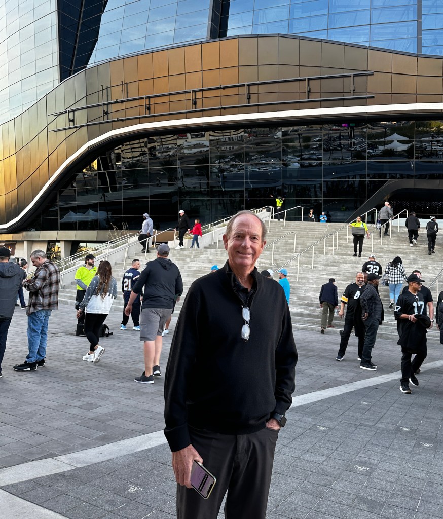 Allegiant Stadium (which will host the Super Bowl in February) is just over I-15 from the end of the Las Vegas Strip (Mandalay Bay Hotel) but about a 2 mile walk. There is bridge from The Strip to the stadium that is cut-off to car traffic on game days, making it easy and safe for walkers. We Übered to the game from the Aria Hotel (figuring we would need to walk back to our hotel), and the stadium has everything efficiently organized for easy drop-off and pick-up for ride-share.