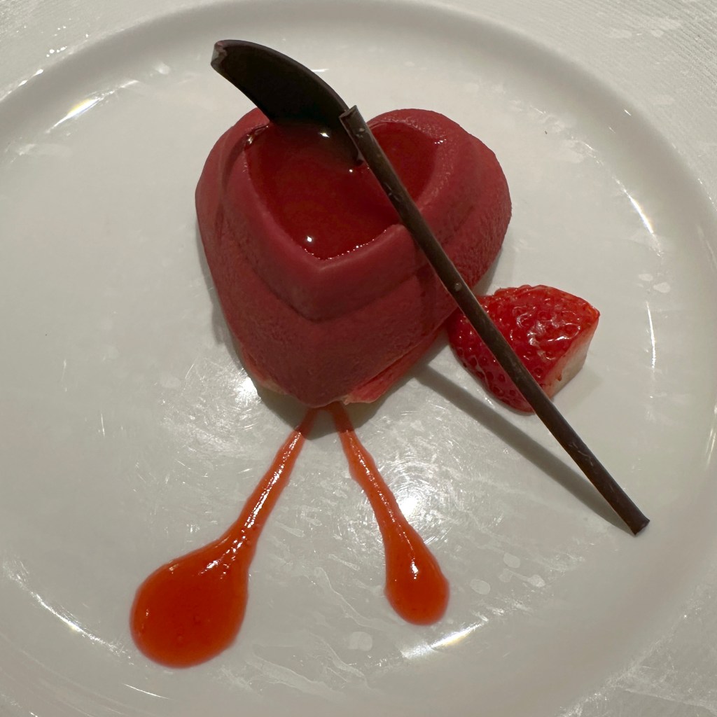 The famed dessert on Princess - for years - has been a little heart-shaped cake, covered in ganache and served over a puddle of raspberry sauce. Now the cake seems to be chocolate in the center, but surrounded by a raspberry (?) cake? Confused, it had a raspberry taste, but garnished with a strawberry and two hard chocolate pieces. Obviously more research is needed, but sad they messed with the classic.