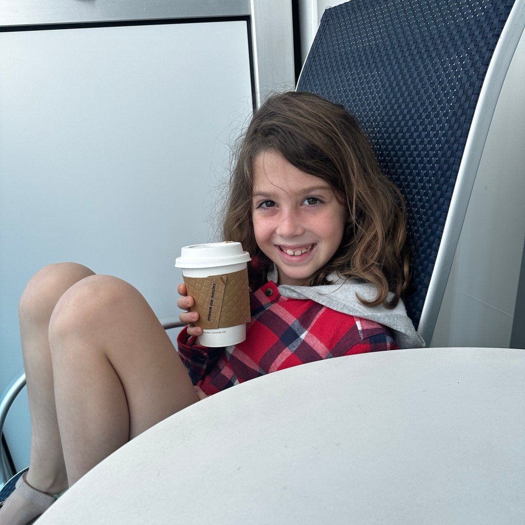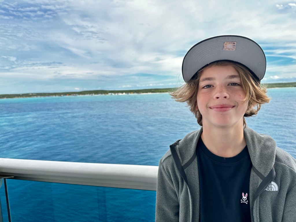 Not Princess Cays, Bahamas: Note from late last night (who am I kidding - Dave and I were in bed at nine o’clock): We all had dinner together in the Santorini dining room. Tis a bit fancy with uniformed waiters, white table cloths and lots of cutlery. I had to beg Leo to remove his baseball cap… which is a new Bengals hat. He has not yet removed the hologram stickers from the brim… reminding me of Minnie Pearl, but not a reference Leo would understand. He did eat hatless. Our meals were delightful. Leo had a shrimp cocktail as his appetizer, then had a lobster tail for his entree. Everyone else enjoyed risotto, roasted chicken, salmon, linguine and clams, and delicious salads. Lucile ordered a hotdog!