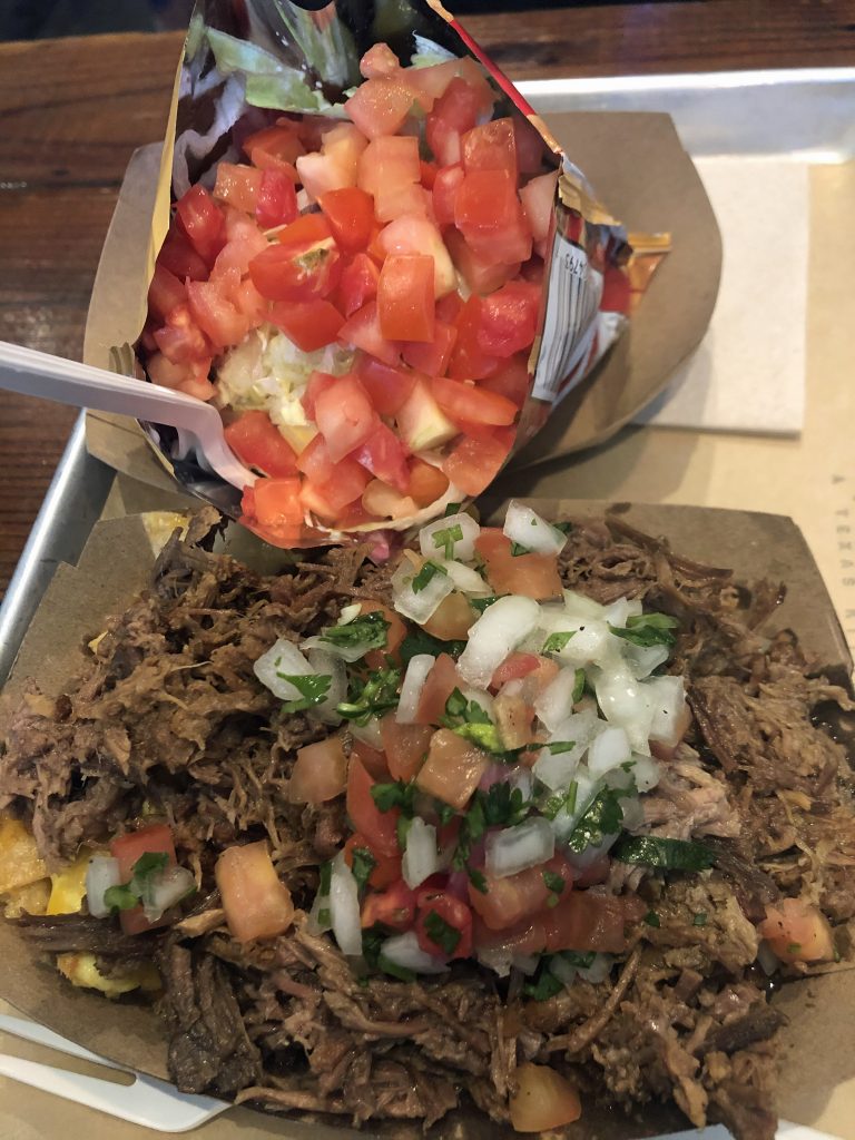 I finally tried their Frito Pie, served traditionally in the Frito bag, but I dumped it out into the paper bowl for an easier dining experience. It was really good – smothered in brisket, cheese, chopped tomato, pickled red onion and jalapeno slices. DT had their famed migas: scrambled eggs, brisket, cheese, and pico de gallo over tortilla chips.
