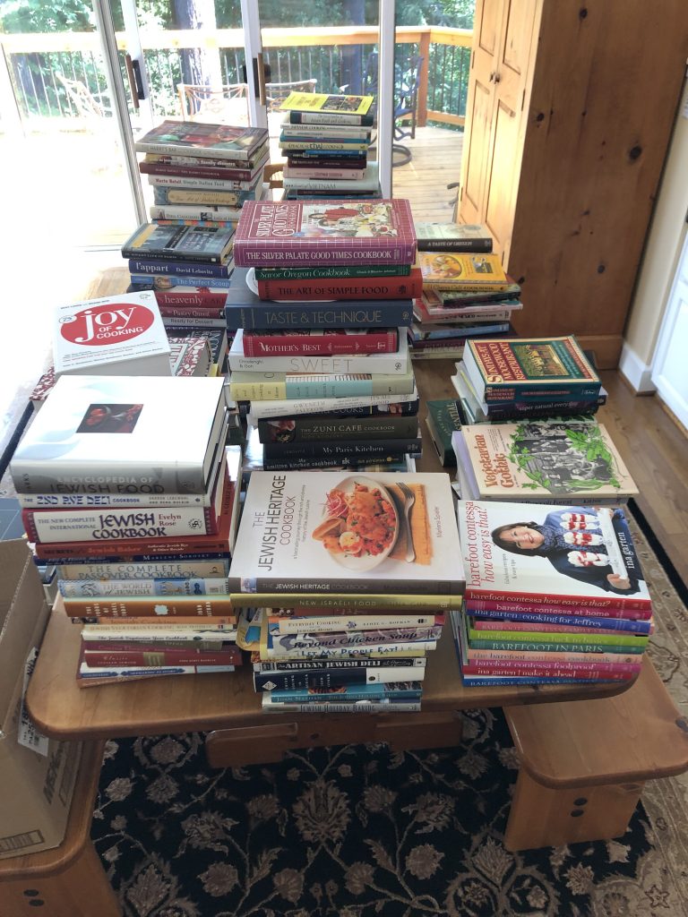 This is the before photo. It does not include the reference books, Jewish cookbooks, or “general compilation” books from my office bookshelves. Going all Marie Kondo, I gathered every cookbook in the house, and stacked them according to genre on the large dinette table.