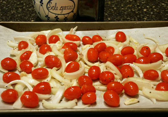 Heat oven to 400°. Line a baking sheet with parchment paper. Place the whole cherry or grape tomatoes, slivered onion and garlic on the parchment paper. Drizzle with one tablespoon olive oil and sprinkle with salt and pepper to taste. Using your fingers, toss the vegetables in the olive oil to evenly coat. Place in hot oven and roast for 30 minutes, or until tomatoes burst and onions are turning brown. Remove to rack and let cool for a few minutes.