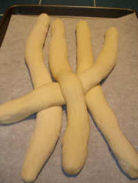 Use dough setting. After cycle is complete, roll dough on a floured board. Let rest 10 minutes. Divide dough into four equal pieces and roll into four long sausage-shapes, about one foot long each. Place on a large baking sheet, preferably lined with parchment paper (or lightly oiled). (The baking sheet in the accompanying photos is 17×12 inches.)
