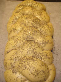 When the dough has doubled in size, beat one egg well with a tablespoon of water and carefully brush this mixture over the top of the bread and sprinkle a topping of your choice – poppy or sesame seeds are traditional, and it represents “manna from heaven”. Bake at 375° for 25-30 minutes, until loaf is well-browned and sounds hollow when tapped on the bottom. Remove to a rack to cool.