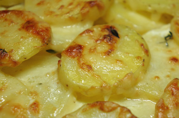 Oil a 10-to-11 inch quiche pan (alternatively, use a pie pan or an 8×8-inch baking dish – do not use a pan with a removable bottom!). Layer half of the cooked sliced potatoes evenly on the bottom of the pan. Sprinkle half the grated Gruyere cheese over, sprinkle the garlic over all, then add a pinch of grated nutmeg, black pepper to taste and a little fresh thyme, if desired. Place the remaining potatoes evenly over the first layer, pour the half & half over all. Top with a layer of the remaining grated Gruyere.