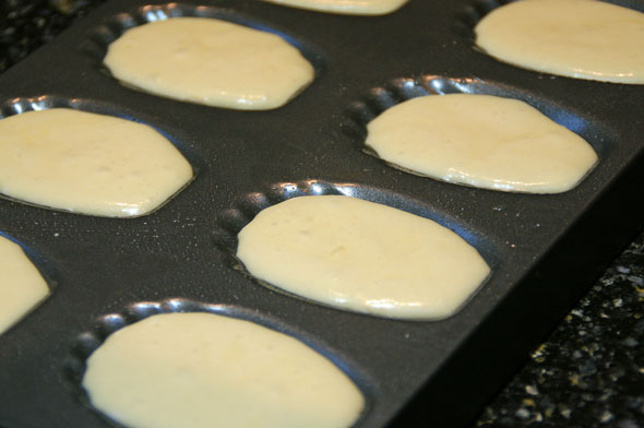 Heat oven to 350°. Use a pastry brush or a paper towel to smear soft butter into the Madeleine mold, carefully covering all the little ridges. Spoon the chilled dough into the Madeleine mold, filling each shell about 3/4 full.