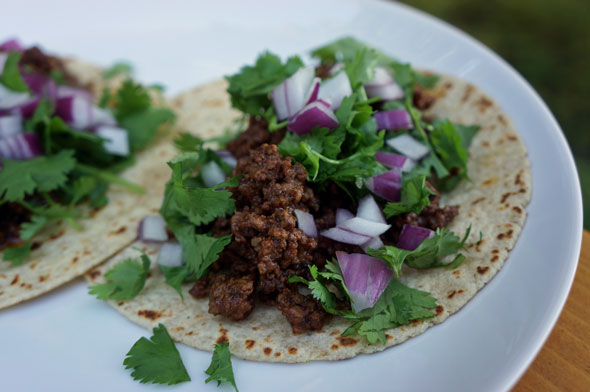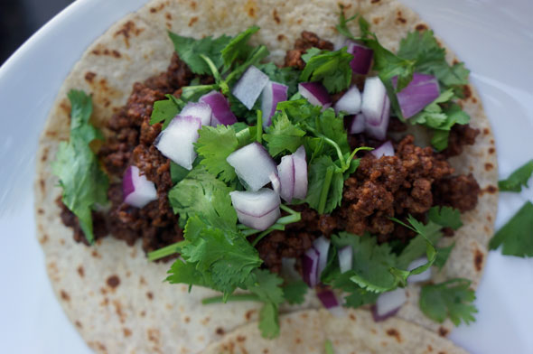 Heat a large skillet over a medium flame. Coat bottom lightly with oil, then saute the ground meat with the garlic until just cooked through. (Drain to remove excess fat, if desired.) Sprinkle spice mixture over all, stir well to completely coat the meat with the spices, about one minute. Sprinkle lime juice over all. Remove from heat. Serve immediately in warm tortillas and garnish with chopped cilantro leaves and red onion. Serves 4.