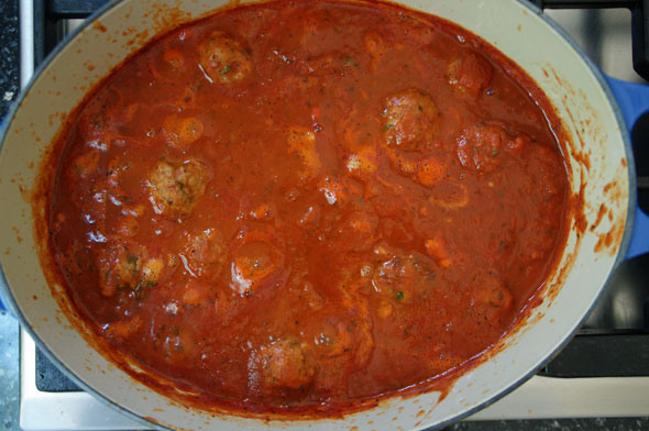 Heat the red sauce in a Dutch oven or similar pot with a tight-fitting lid. When the sauce begins to boil, carefully drop the meatballs, one at a time, into the sauce. Carefully shake the pan a bit, or gently use a spoon to cover each meatball in a little sauce. DO NOT STIR. Cover, and gently simmer the meatballs for 25 minutes, then remove from heat and let rest for five minutes. Serve over hot spaghetti pasta and garnish with additional grated parmesan cheese or chopped parsley or basil leaves, if desired. Serves 6 (or more).