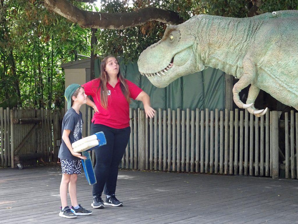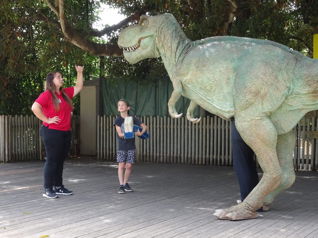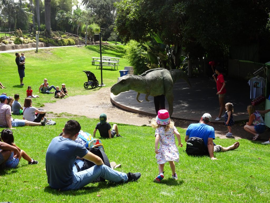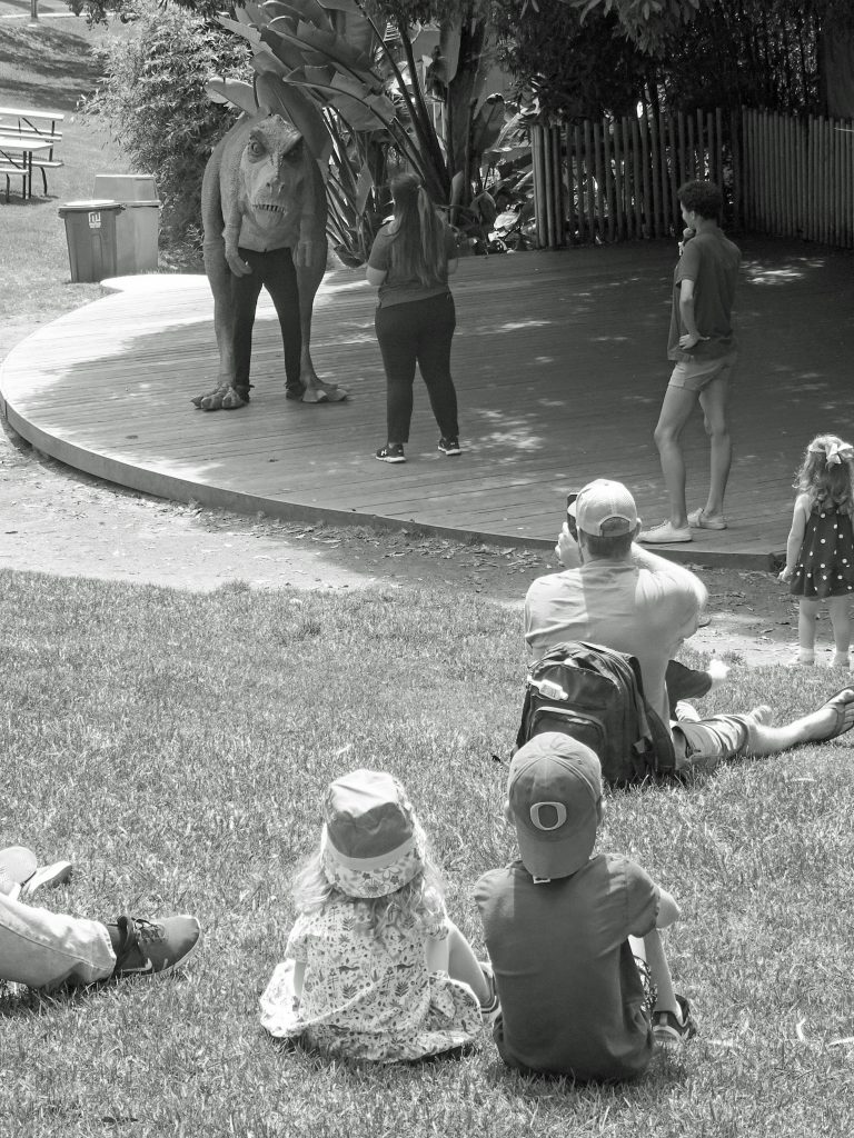 All the while, trainers were asking the kids on the lawn why the dinosaur had sharp teeth. Because he was a vegan? Omnivore? The kids just laughed. Kids are so smart these days – so many were yelling out: He’s a carnivore!