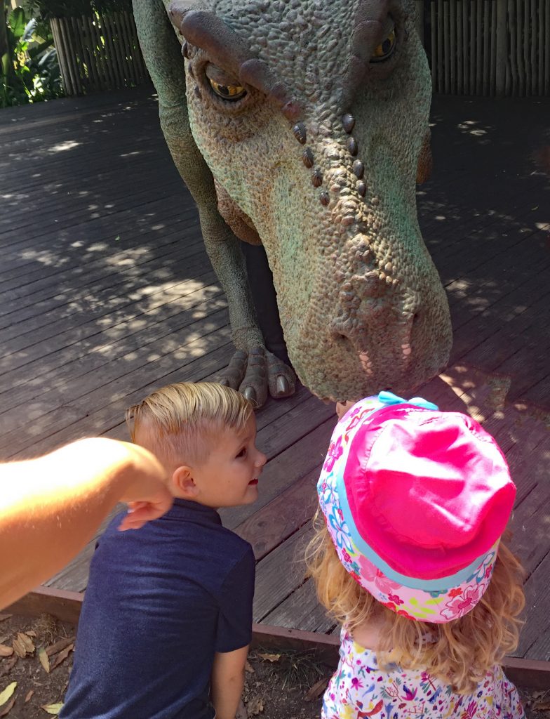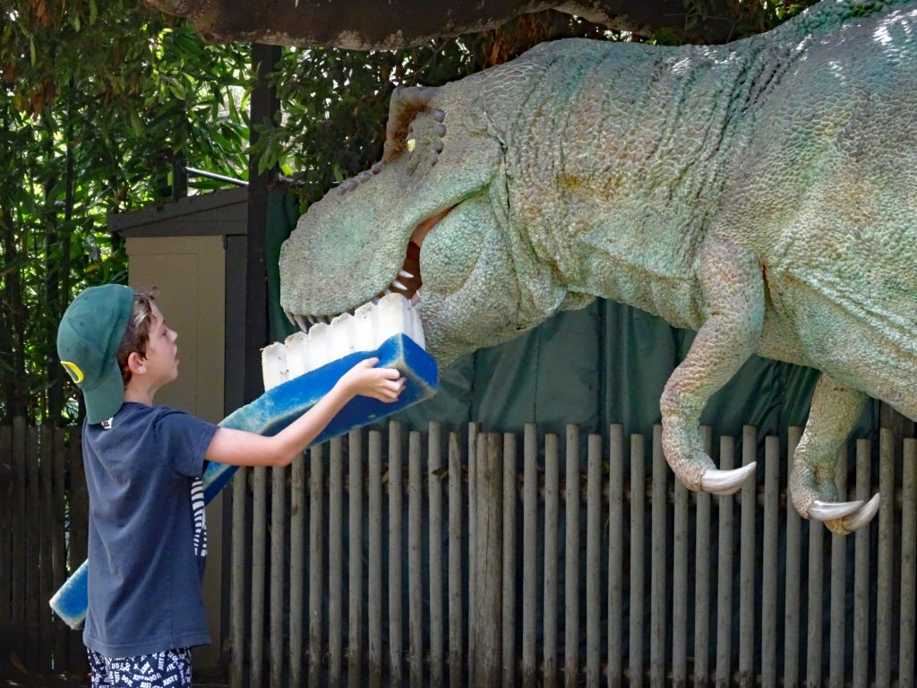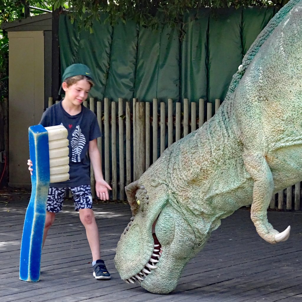 After exploring the zoo for a while, we came upon an amphitheater with a T-Rex on stage. DJ was a most impressive dinosaur and had all the kids at attention.