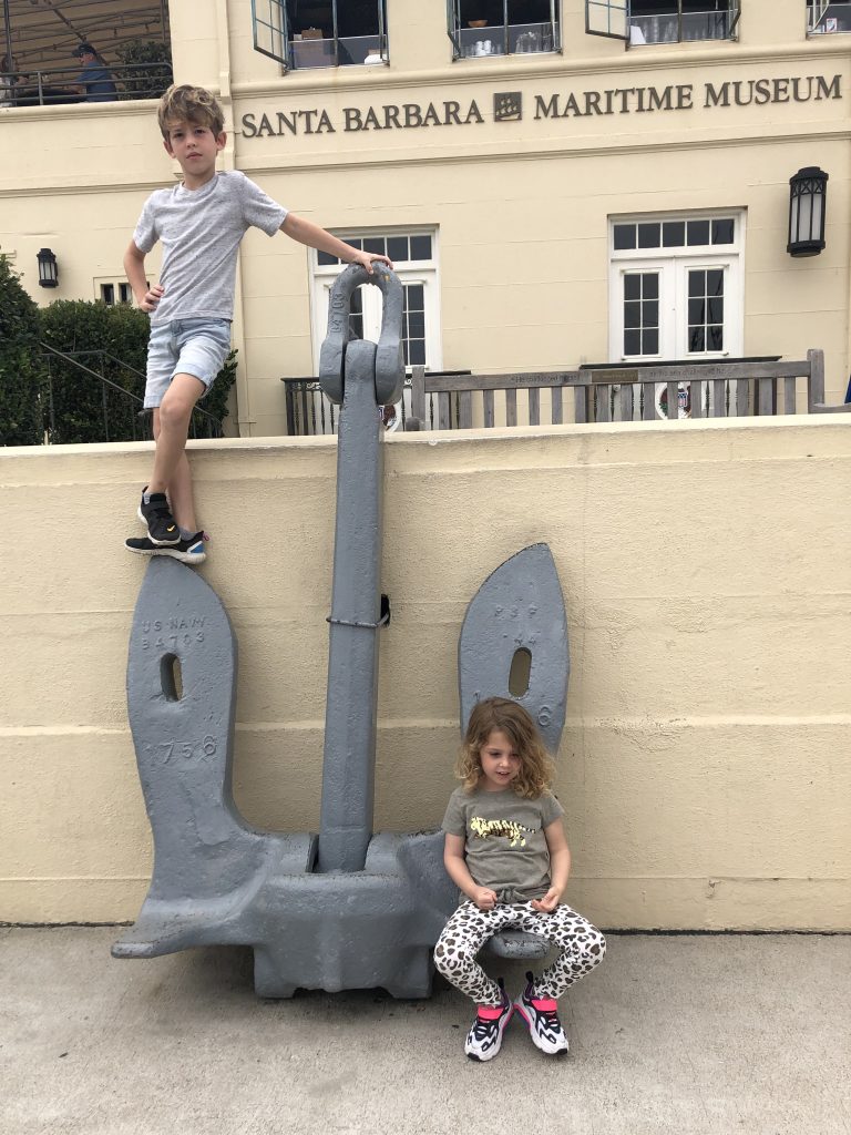 Santa Barbara, California: Another day of fun with the kids. We did have a late morning, as I decided taking two kids through the buffet line was too much of a chore for me before coffee. We waited for Bubba to finish his work-out and shower, so we didn’t get to breakfast until well after nine o’clock. (No worries, Lisa, your kids had a piece of left-over pizza from the mini-bar fridge before breakfast. Breakfast of Champions.) Everyone ate well and fueled-up for our morning adventure. The hotel gives each room a two-hour free rental of a bicycle surrey, and the carts are parked literally just outside our patio, so the kids have been asking when when when. There are several different size carts, but we opted for the smallest surrey. Lucy was too small to even consider as a fuel source. Leo could only reach the pedals if he was pedaling standing up. I could just barely reach the pedals, but Leo always wanted to pedal… meaning our power came 90% from poor DT. Sadly, I did not get a photo of us all on the little cart, but we rode it all the way down to the harbor. The fog was thick this morning, but the temperatures were warm. We parked the surrey and walked down to the end of the breakwater.