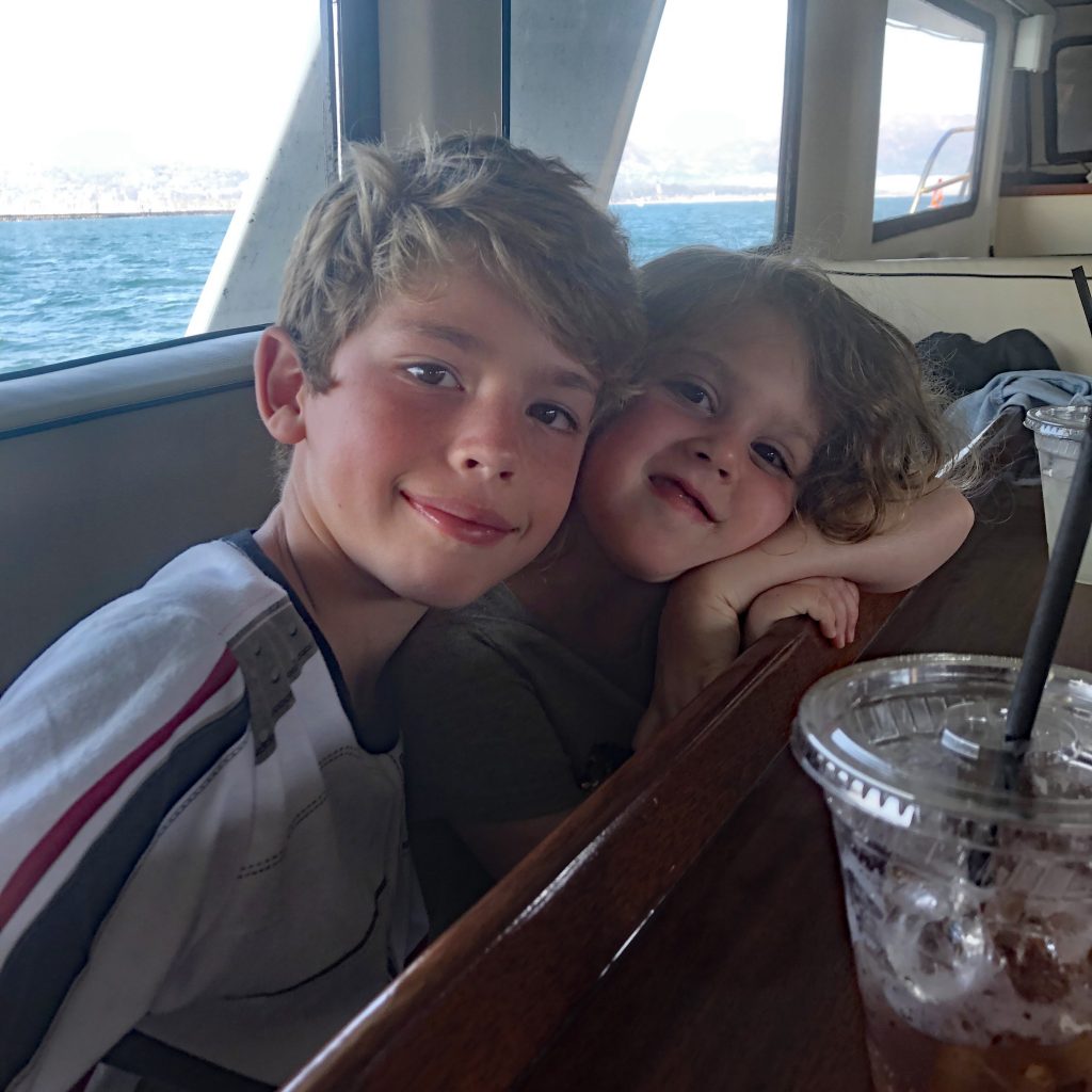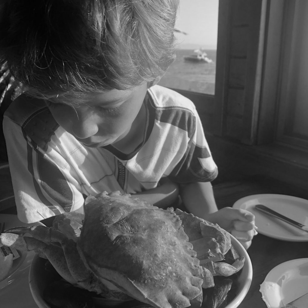 I had made dinner reservations at a touristy seafood place on the wharf. Moby Dick Restaurant is not the most highly-rated joint in town, but I knew the kids would love the “ambiance” of dining on a pier over the sea, and Leo is crazy for seafood and shellfish. (In the end, our meals were quite good and our server was super.) Leo and Dave ordered a massive (and massively expensive) steamed seafood monstrosity of mussels, clams, and shrimp poached in clam juice – with a huge Dungeness crab on top!