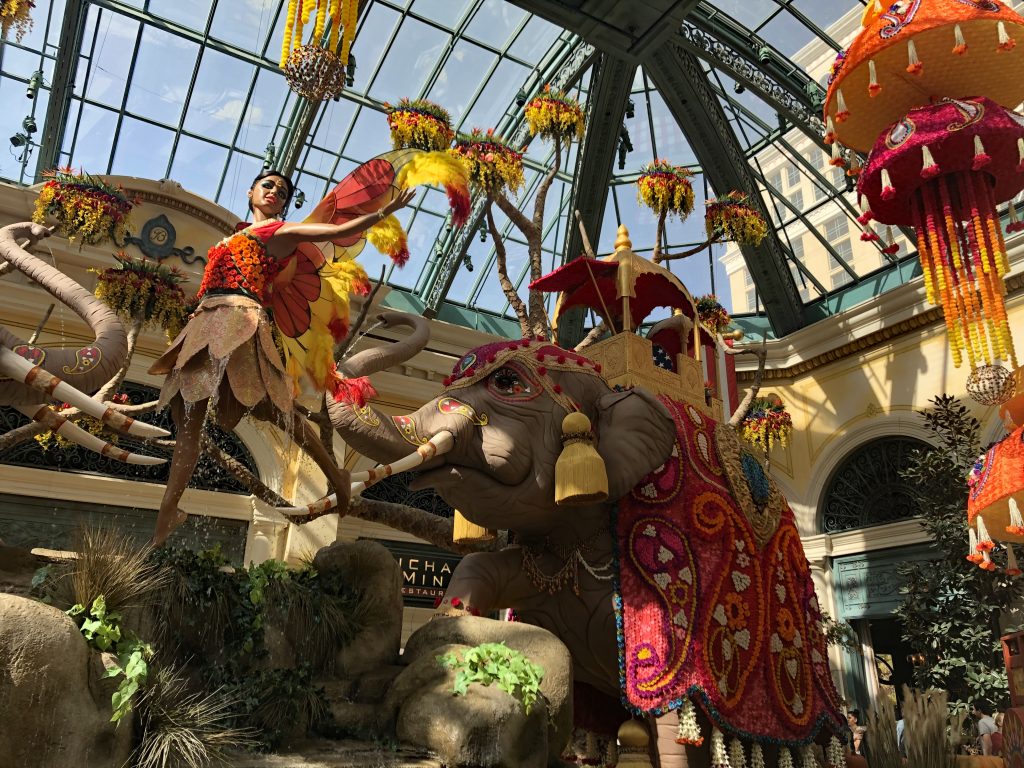 After all that walking and dancing yesterday, we slept-in a bit, then walked over to the Bellagio Hotel to see how they have decorated their conservatory for fall. Every year, the theme is different, yet some elements remain the same. This year, the space has been renovated into a gorgeous Indian-themed garden filled with gourds, massive pumpkins, flowers and two elephants!