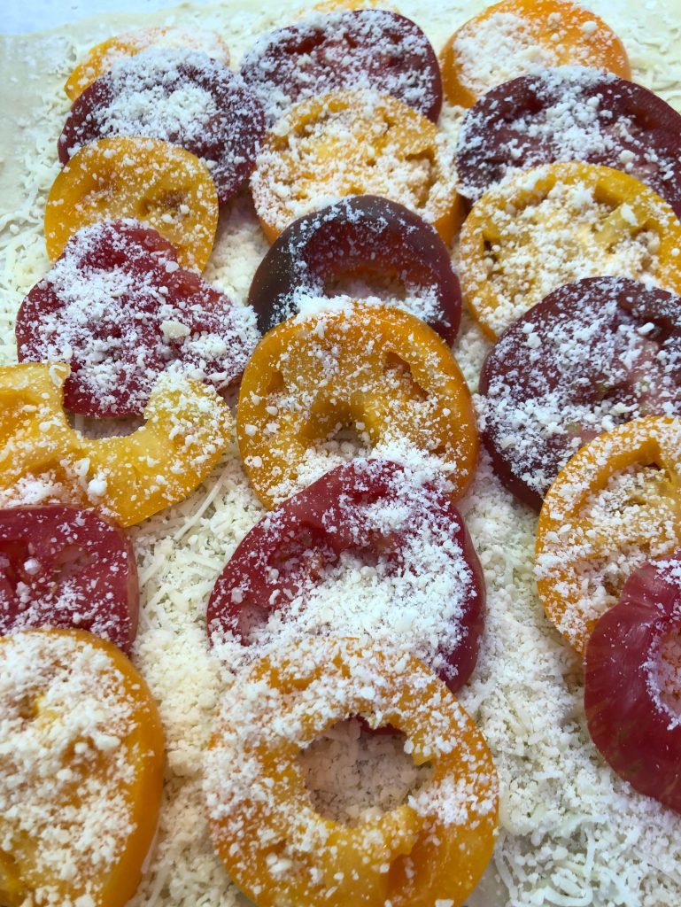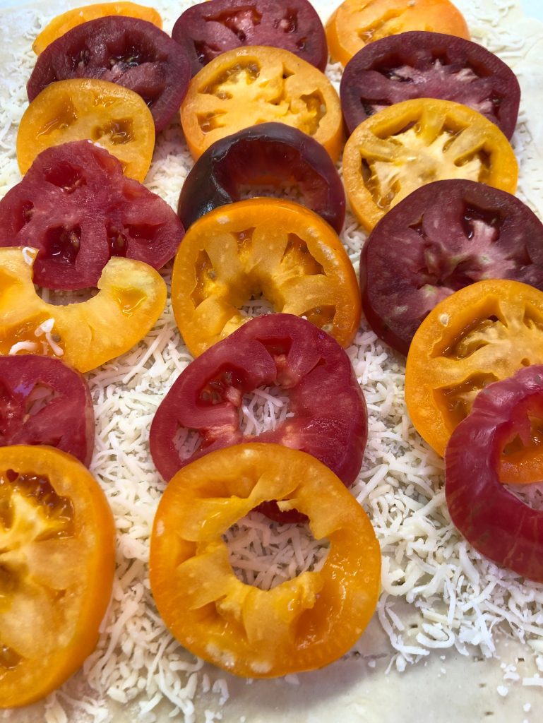 For our pizza tonight, I spread about 1 cup of “Italian Blend” grated (already grated in a bag, y’all) cheese over the poked center area, then I “decoratively” layered the drained tomatoes slices over the cheese: