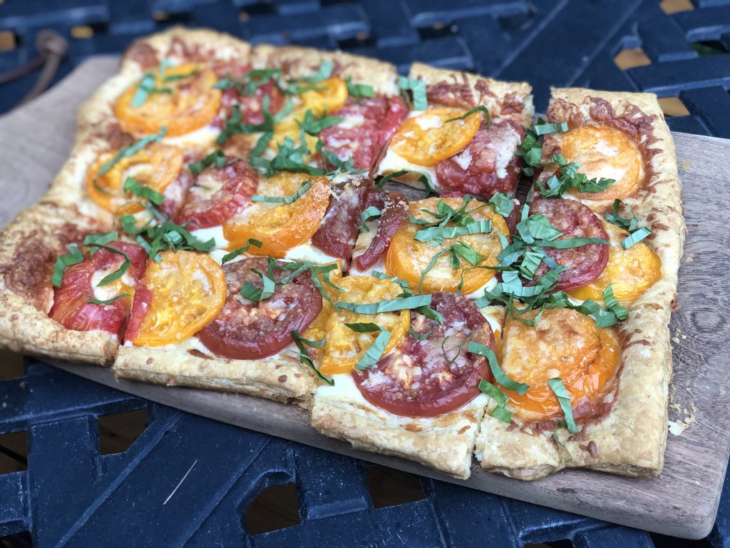 Puff pastry is so easy to work with. Just thaw it for an hour or so at room temperature (or overnight in the fridge). When you bring the pastry from the freezer to thaw, slice three or four medium-sized tomatoes and lay the slices individually on a few layers of paper towels, so the moisture/juices will be mostly removed from the tomatoes. Use the best, ripest, tomatoes you can find. This recipe is perfect for all the gorgeous heirloom tomatoes appearing now (July-August) in the markets. Cover the slices with another layer or two of paper towels and let them rest while the dough thaws.