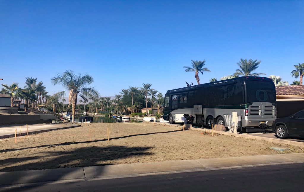 Though the view from our lot, straight down the canal towards the mountains of Joshua Tree National Park, is still perfect, the view to our left is quite changed, as the two empty lots next to us are under construction. Leo has lost his football field! The lot directly to our left was supposed to begin building in May, but there were some troubles with the architect/permits (I have heard via rumor only), and the project was delayed until last week. Total bummer for us, having to deal with construction noise and dust, but one nice thing: the resort has changed construction hours during “the season” to only Monday-Thursday. Thankfully, the jack-hammering was completed before our arrival.